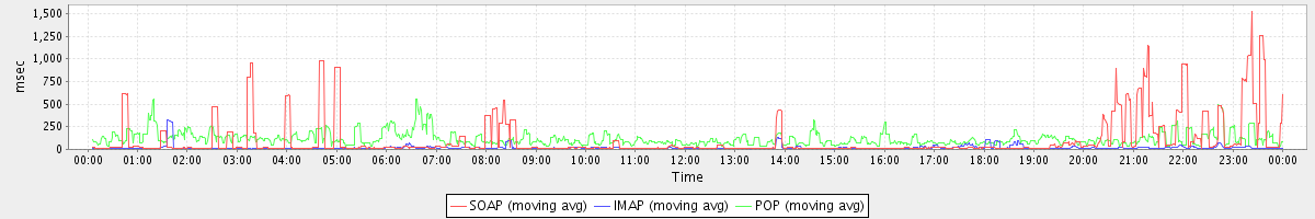 avg(SendMsgRequest) = 970.94 avg(SyncGalRequest) = 4080.64 avg(ForwardAppointmentInviteRequest) = 749.00 avg(SendInviteReplyRequest) = 1000.41 avg(SetTaskRequest) = 1636.61 avg(ItemActionRequest.delete) = 720.36 avg(ApplyFilterRulesRequest) = 18806.33 avg(FolderActionRequest.empty) = 3561.28 avg(BackupRequest) = 18440.00 avg(GetQuotaUsageRequest) = 1257.00