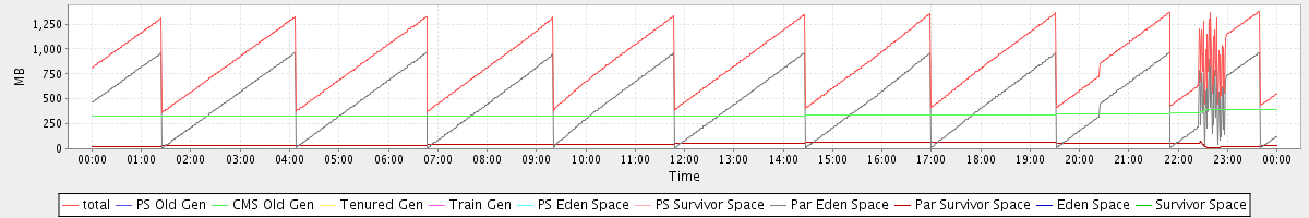 avg(total) = 876.37 avg(PS Old Gen) = 0.00 avg(CMS Old Gen) = 336.24 avg(Tenured Gen) = 0.00 avg(Train Gen) = 0.00 avg(PS Eden Space) = 0.00 avg(PS Survivor Space) = 0.00 avg(Par Eden Space) = 495.07 avg(Par Survivor Space) = 45.06 avg(Eden Space) = 0.00 avg(Survivor Space) = 0.00