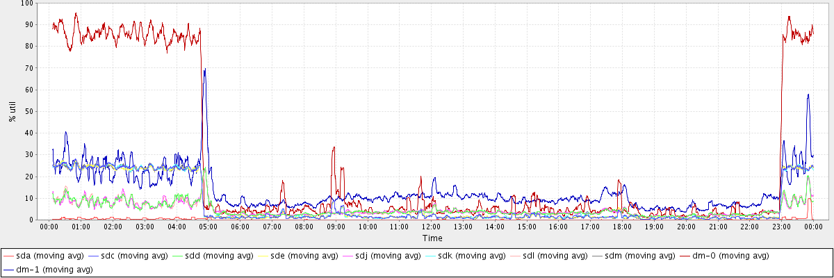 avg(sda) = 0.26 avg(sdc) = 6.95 avg(sdd) = 4.59 avg(sde) = 6.89 avg(sdj) = 4.58 avg(sdk) = 6.94 avg(sdl) = 4.57 avg(sdm) = 6.91 avg(dm-0) = 24.64 avg(dm-1) = 13.23