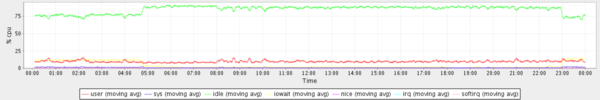 avg(user) = 9.55 avg(sys) = 0.98 avg(idle) = 85.07 avg(iowait) = 4.14 avg(nice) = 0.00 avg(irq) = 0.02 avg(softirq) = 0.23