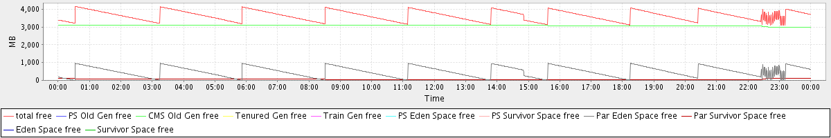 avg(total free) = 3640.15 avg(PS Old Gen free) = 0.00 avg(CMS Old Gen free) = 3088.83 avg(Tenured Gen free) = 0.00 avg(Train Gen free) = 0.00 avg(PS Eden Space free) = 0.00 avg(PS Survivor Space free) = 0.00 avg(Par Eden Space free) = 493.30 avg(Par Survivor Space free) = 58.02 avg(Eden Space free) = 0.00 avg(Survivor Space free) = 0.00