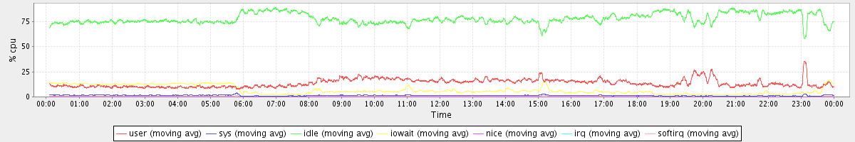 avg(user) = 13.65 avg(sys) = 1.38 avg(idle) = 77.77 avg(iowait) = 6.70 avg(nice) = 0.00 avg(irq) = 0.05 avg(softirq) = 0.46