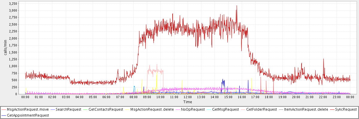 max(MsgActionRequest.move) = 615.00 max(SearchRequest) = 274.00 max(GetContactsRequest) = 247.00 max(MsgActionRequest.delete) = 803.00 max(NoOpRequest) = 252.00 max(GetMsgRequest) = 300.00 max(GetFolderRequest) = 1080.00 max(ItemActionRequest.delete) = 246.00 max(SyncRequest) = 3175.00 max(GetAppointmentRequest) = 539.00