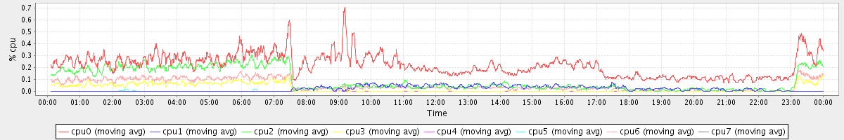 avg(cpu0) = 0.22 avg(cpu1) = 0.02 avg(cpu2) = 0.09 avg(cpu3) = 0.02 avg(cpu4) = 0.00 avg(cpu5) = 0.00 avg(cpu6) = 0.05 avg(cpu7) = 0.00
