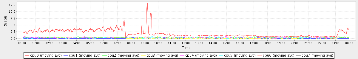 avg(cpu0) = 1.91 avg(cpu1) = 0.12 avg(cpu2) = 0.24 avg(cpu3) = 0.12 avg(cpu4) = 0.21 avg(cpu5) = 0.13 avg(cpu6) = 0.18 avg(cpu7) = 0.06
