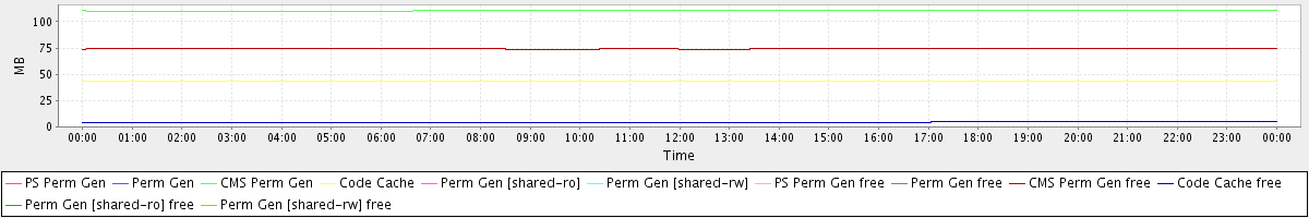 avg(PS Perm Gen) = 0.00 avg(Perm Gen) = 0.00 avg(CMS Perm Gen) = 110.68 avg(Code Cache) = 43.27 avg(Perm Gen [shared-ro]) = 0.00 avg(Perm Gen [shared-rw]) = 0.00 avg(PS Perm Gen free) = 0.00 avg(Perm Gen free) = 0.00 avg(CMS Perm Gen free) = 74.18 avg(Code Cache free) = 4.54 avg(Perm Gen [shared-ro] free) = 0.00 avg(Perm Gen [shared-rw] free) = 0.00