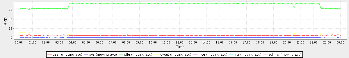 avg(user) = 6.60 avg(sys) = 0.71 avg(idle) = 89.64 avg(iowait) = 3.03 avg(nice) = 0.00 avg(irq) = 0.00 avg(softirq) = 0.02