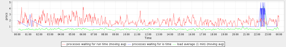 avg(processes waiting for run time) = 0.73 avg(processes waiting for io time) = 0.08 avg(load average (1 min)) = 0.64