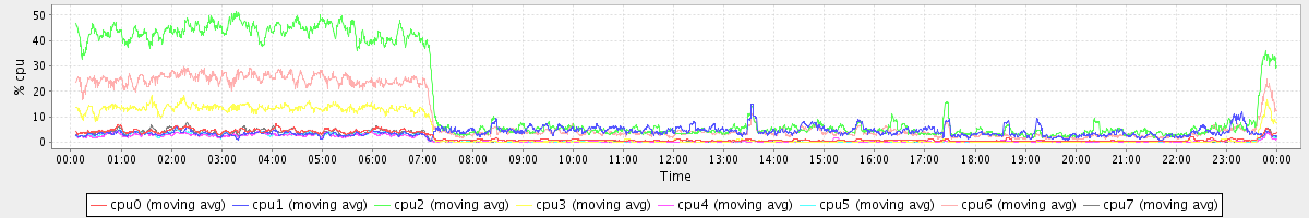 avg(cpu0) = 1.63 avg(cpu1) = 0.13 avg(cpu2) = 0.24 avg(cpu3) = 0.13 avg(cpu4) = 0.12 avg(cpu5) = 0.09 avg(cpu6) = 0.15 avg(cpu7) = 0.11
