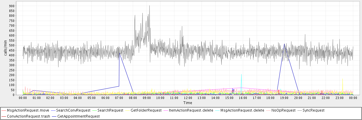 max(MsgActionRequest.move) = 51.00 max(SearchConvRequest) = 65.00 max(SearchRequest) = 46.00 max(GetFolderRequest) = 164.00 max(ItemActionRequest.delete) = 72.00 max(MsgActionRequest.delete) = 210.00 max(NoOpRequest) = 84.00 max(SyncRequest) = 903.00 max(ConvActionRequest.trash) = 49.00 max(GetAppointmentRequest) = 516.00