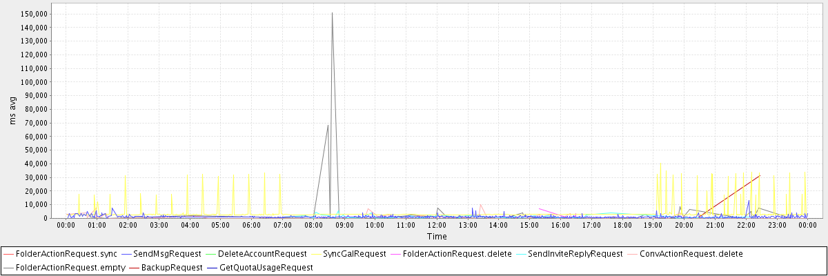 avg(FolderActionRequest.sync) = 8177.00 avg(SendMsgRequest) = 1073.07 avg(DeleteAccountRequest) = 6594.00 avg(SyncGalRequest) = 5183.56 avg(FolderActionRequest.delete) = 3146.50 avg(SendInviteReplyRequest) = 1257.33 avg(ConvActionRequest.delete) = 880.83 avg(FolderActionRequest.empty) = 5269.16 avg(BackupRequest) = 15926.50 avg(GetQuotaUsageRequest) = 1279.00