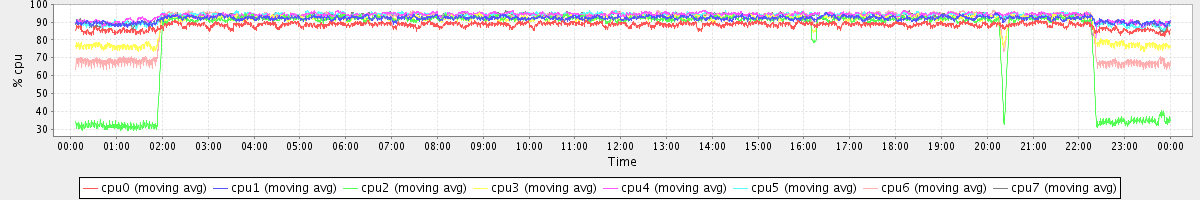 avg(cpu0) = 88.19 avg(cpu1) = 91.98 avg(cpu2) = 82.68 avg(cpu3) = 89.91 avg(cpu4) = 93.65 avg(cpu5) = 93.34 avg(cpu6) = 90.02 avg(cpu7) = 92.98