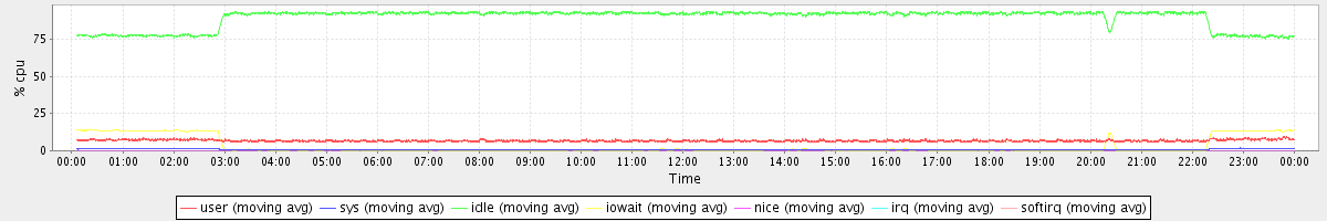 avg(user) = 6.73 avg(sys) = 0.76 avg(idle) = 89.61 avg(iowait) = 2.87 avg(nice) = 0.00 avg(irq) = 0.00 avg(softirq) = 0.02