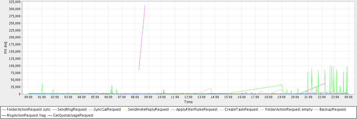 avg(FolderActionRequest.sync) = 9518.00 avg(SendMsgRequest) = 953.55 avg(SyncGalRequest) = 6508.09 avg(SendInviteReplyRequest) = 1354.54 avg(ApplyFilterRulesRequest) = 198758.50 avg(CreateTaskRequest) = 1271.00 avg(FolderActionRequest.empty) = 2378.00 avg(BackupRequest) = 19602.50 avg(MsgActionRequest.!tag) = 2337.00 avg(GetQuotaUsageRequest) = 1317.00
