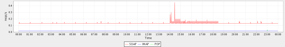 max(SearchRequest) = 7.00 max(BackupRequest) = 1.00 max(GetAccountRequest) = 1.00 max(GetInfoRequest) = 4.00 max(SearchConvRequest) = 1.00 max(GetMailboxMetadataRequest) = 2.00 max(AuthRequest) = 3.00 max(GetMiniCalRequest) = 4.00 max(NoOpRequest) = 4.00 max(GetDomainInfoRequest) = 3.00
