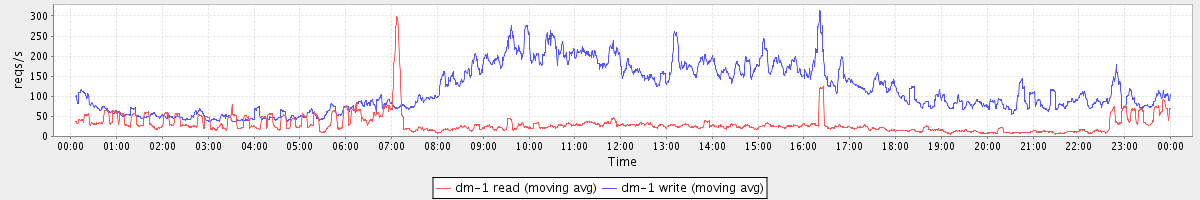 avg(dm-1 read) = 299.08 avg(dm-1 write) = 744.38