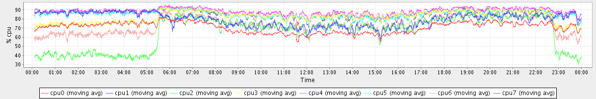 avg(cpu0) = 70.74 avg(cpu1) = 79.42 avg(cpu2) = 66.10 avg(cpu3) = 82.66 avg(cpu4) = 88.40 avg(cpu5) = 85.35 avg(cpu6) = 73.71 avg(cpu7) = 85.47