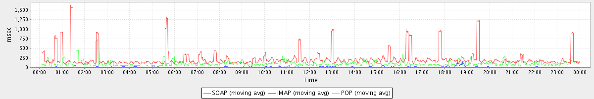 avg(SendMsgRequest) = 721.04 avg(GetContactsRequest) = 720.71 avg(DeleteAccountRequest) = 10459.00 avg(SyncGalRequest) = 9478.85 avg(FolderActionRequest.delete) = 743.60 avg(SendInviteReplyRequest) = 573.00 avg(FolderActionRequest.empty) = 3128.53 avg(SyncGalAccountRequest) = 36856.54 avg(BackupRequest) = 23309.67 avg(GetQuotaUsageRequest) = 1173.00