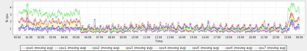 avg(cpu0) = 1.46 avg(cpu1) = 0.13 avg(cpu2) = 0.20 avg(cpu3) = 0.11 avg(cpu4) = 0.07 avg(cpu5) = 0.09 avg(cpu6) = 0.13 avg(cpu7) = 0.08
