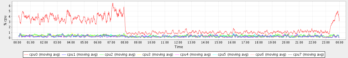 avg(cpu0) = 2.03 avg(cpu1) = 0.28 avg(cpu2) = 0.37 avg(cpu3) = 0.31 avg(cpu4) = 0.24 avg(cpu5) = 0.28 avg(cpu6) = 0.29 avg(cpu7) = 0.27