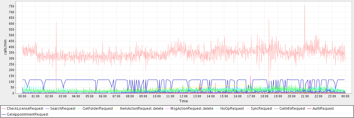 max(CheckLicenseRequest) = 84.00 max(SearchRequest) = 51.00 max(GetFolderRequest) = 93.00 max(ItemActionRequest.delete) = 75.00 max(MsgActionRequest.delete) = 150.00 max(NoOpRequest) = 82.00 max(SyncRequest) = 756.00 max(GetInfoRequest) = 88.00 max(AuthRequest) = 86.00 max(GetAppointmentRequest) = 121.00