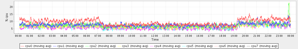 avg(cpu0) = 9.32 avg(cpu1) = 7.57 avg(cpu2) = 7.44 avg(cpu3) = 6.74 avg(cpu4) = 5.94 avg(cpu5) = 6.12 avg(cpu6) = 6.70 avg(cpu7) = 6.43