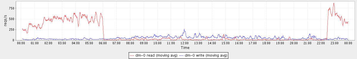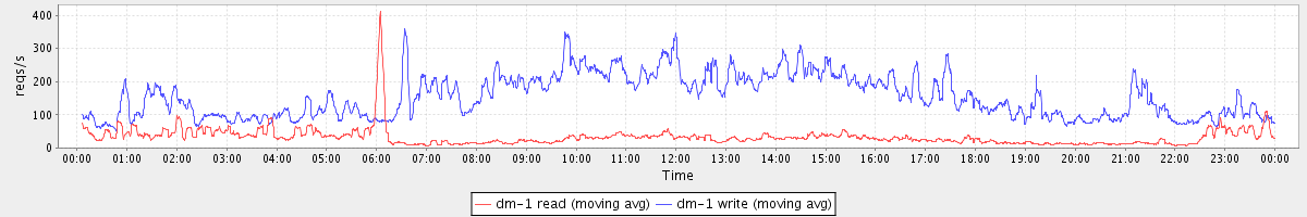 avg(dm-1 read) = 366.21 avg(dm-1 write) = 928.77