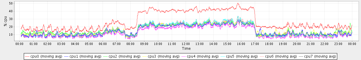 avg(cpu0) = 27.17 avg(cpu1) = 14.68 avg(cpu2) = 15.70 avg(cpu3) = 15.14 avg(cpu4) = 12.30 avg(cpu5) = 15.11 avg(cpu6) = 15.38 avg(cpu7) = 14.80