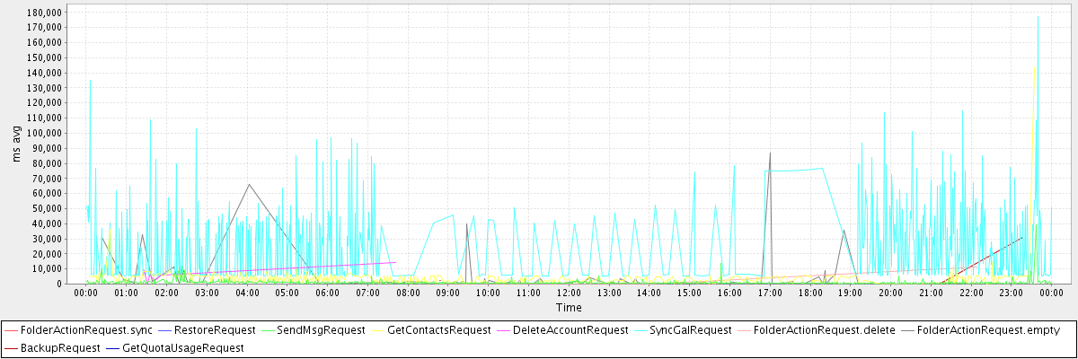avg(FolderActionRequest.sync) = 2474.50 avg(RestoreRequest) = 39689.00 avg(SendMsgRequest) = 976.94 avg(GetContactsRequest) = 2032.51 avg(DeleteAccountRequest) = 5849.78 avg(SyncGalRequest) = 23241.68 avg(FolderActionRequest.delete) = 1305.22 avg(FolderActionRequest.empty) = 3752.42 avg(BackupRequest) = 15798.00 avg(GetQuotaUsageRequest) = 1298.00