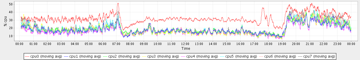 avg(cpu0) = 32.35 avg(cpu1) = 18.40 avg(cpu2) = 19.01 avg(cpu3) = 18.36 avg(cpu4) = 16.66 avg(cpu5) = 19.05 avg(cpu6) = 19.40 avg(cpu7) = 20.11