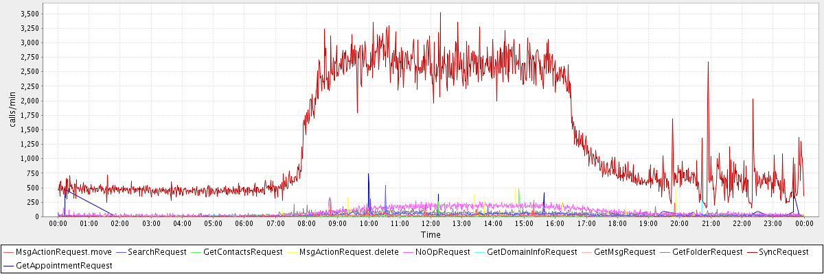 max(MsgActionRequest.move) = 285.00 max(SearchRequest) = 543.00 max(GetContactsRequest) = 481.00 max(MsgActionRequest.delete) = 643.00 max(NoOpRequest) = 277.00 max(GetDomainInfoRequest) = 283.00 max(GetMsgRequest) = 347.00 max(GetFolderRequest) = 222.00 max(SyncRequest) = 3514.00 max(GetAppointmentRequest) = 740.00