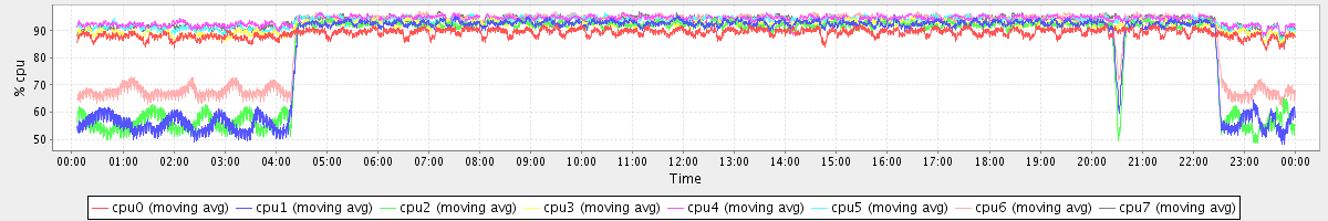 avg(cpu0) = 89.23 avg(cpu1) = 83.57 avg(cpu2) = 83.29 avg(cpu3) = 91.71 avg(cpu4) = 93.99 avg(cpu5) = 93.40 avg(cpu6) = 88.13 avg(cpu7) = 93.65