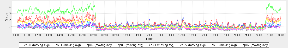 avg(cpu0) = 1.80 avg(cpu1) = 0.16 avg(cpu2) = 0.24 avg(cpu3) = 0.12 avg(cpu4) = 0.07 avg(cpu5) = 0.10 avg(cpu6) = 0.16 avg(cpu7) = 0.09