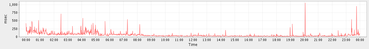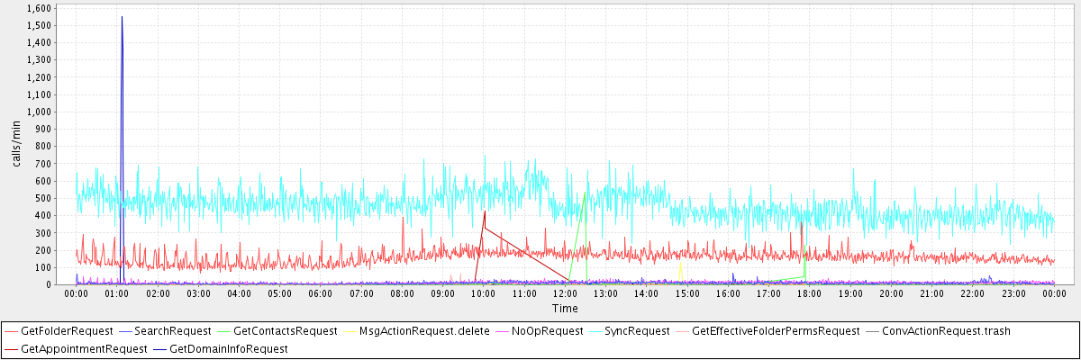 max(GetFolderRequest) = 391.00 max(SearchRequest) = 66.00 max(GetContactsRequest) = 538.00 max(MsgActionRequest.delete) = 129.00 max(NoOpRequest) = 49.00 max(SyncRequest) = 748.00 max(GetEffectiveFolderPermsRequest) = 62.00 max(ConvActionRequest.trash) = 70.00 max(GetAppointmentRequest) = 429.00 max(GetDomainInfoRequest) = 1549.00