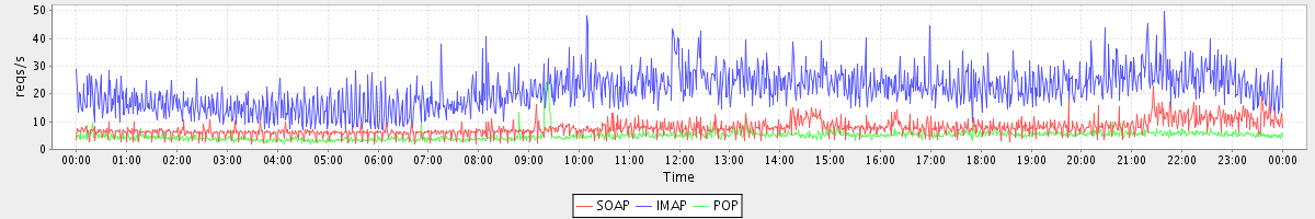 Host zm01.stanford.edu: Mailboxd: Request Rate by Client Protocol
