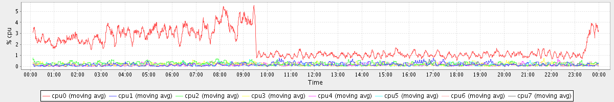 avg(cpu0) = 0.15 avg(cpu1) = 0.01 avg(cpu2) = 0.09 avg(cpu3) = 0.02 avg(cpu4) = 0.00 avg(cpu5) = 0.00 avg(cpu6) = 0.05 avg(cpu7) = 0.00