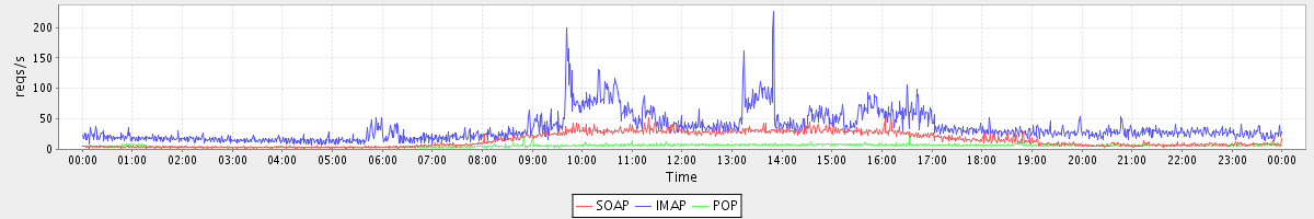 Host zm03.stanford.edu: Mailboxd: Request Rate by Client Protocol