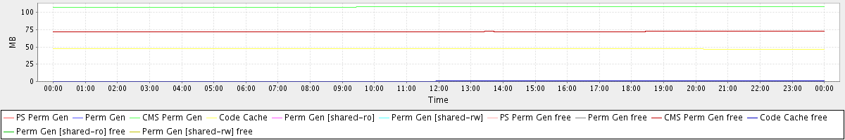 avg(PS Perm Gen) = 0.00 avg(Perm Gen) = 0.00 avg(CMS Perm Gen) = 108.05 avg(Code Cache) = 47.34 avg(Perm Gen [shared-ro]) = 0.00 avg(Perm Gen [shared-rw]) = 0.00 avg(PS Perm Gen free) = 0.00 avg(Perm Gen free) = 0.00 avg(CMS Perm Gen free) = 72.18 avg(Code Cache free) = 0.59 avg(Perm Gen [shared-ro] free) = 0.00 avg(Perm Gen [shared-rw] free) = 0.00