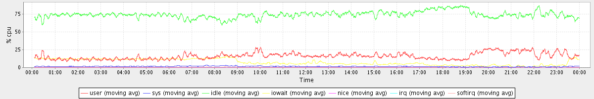 avg(user) = 16.06 avg(sys) = 1.56 avg(idle) = 74.31 avg(iowait) = 7.55 avg(nice) = 0.00 avg(irq) = 0.05 avg(softirq) = 0.48