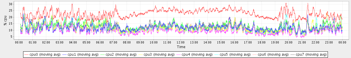 avg(cpu0) = 22.61 avg(cpu1) = 11.95 avg(cpu2) = 12.99 avg(cpu3) = 11.63 avg(cpu4) = 9.60 avg(cpu5) = 11.66 avg(cpu6) = 12.10 avg(cpu7) = 12.50