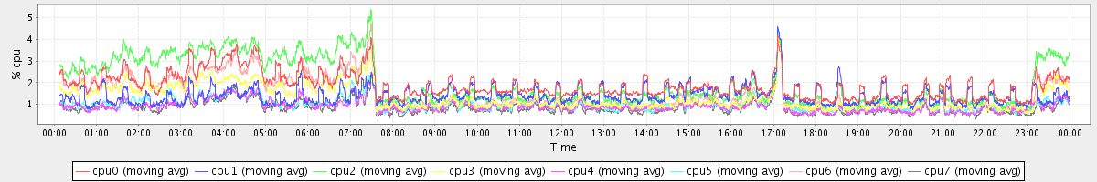 avg(cpu0) = 1.93 avg(cpu1) = 0.17 avg(cpu2) = 0.29 avg(cpu3) = 0.17 avg(cpu4) = 0.10 avg(cpu5) = 0.12 avg(cpu6) = 0.18 avg(cpu7) = 0.11