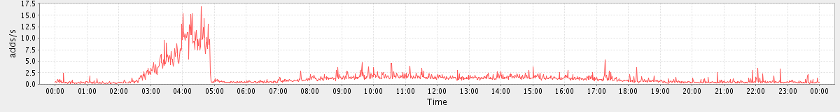 max(MsgActionRequest.move) = 194.00 max(SearchRequest) = 258.00 max(MsgActionRequest.delete) = 1459.00 max(NoOpRequest) = 117.00 max(GetDomainInfoRequest) = 103.00 max(SetAppointmentRequest) = 390.00 max(GetFolderRequest) = 562.00 max(SyncRequest) = 2308.00 max(GetEffectiveFolderPermsRequest) = 127.00 max(GetAppointmentRequest) = 841.00