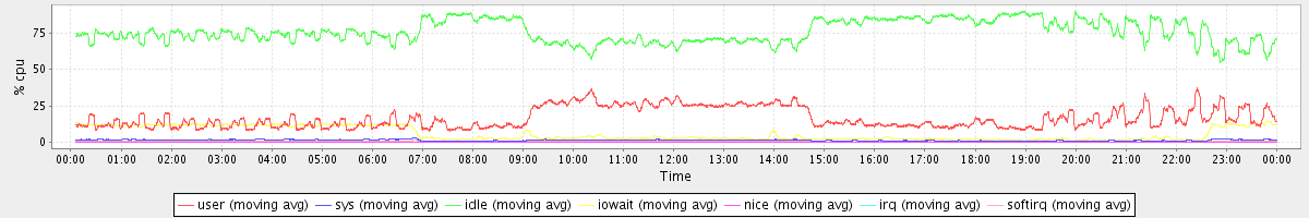 avg(user) = 16.60 avg(sys) = 1.30 avg(idle) = 75.96 avg(iowait) = 5.68 avg(nice) = 0.00 avg(irq) = 0.04 avg(softirq) = 0.41