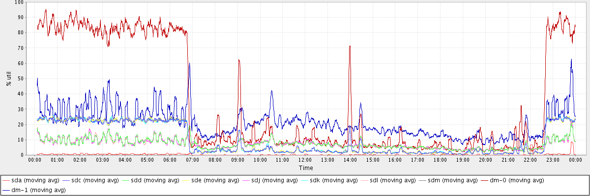 avg(sda) = 0.37 avg(sdc) = 9.47 avg(sdd) = 7.32 avg(sde) = 9.43 avg(sdj) = 7.28 avg(sdk) = 9.43 avg(sdl) = 7.25 avg(sdm) = 9.49 avg(dm-0) = 34.55 avg(dm-1) = 21.22