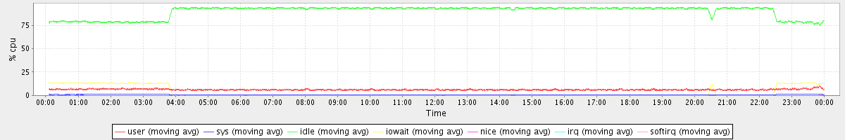 avg(user) = 6.26 avg(sys) = 0.72 avg(idle) = 89.89 avg(iowait) = 3.11 avg(nice) = 0.00 avg(irq) = 0.00 avg(softirq) = 0.02