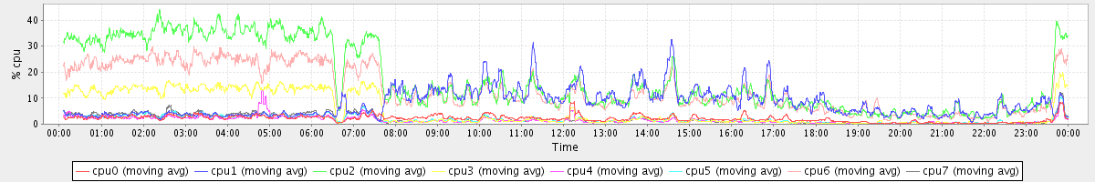 avg(cpu0) = 33.57 avg(cpu1) = 20.63 avg(cpu2) = 20.43 avg(cpu3) = 20.14 avg(cpu4) = 18.70 avg(cpu5) = 21.40 avg(cpu6) = 21.29 avg(cpu7) = 22.65