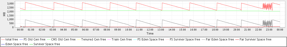 avg(total free) = 2667.64 avg(PS Old Gen free) = 0.00 avg(CMS Old Gen free) = 2106.67 avg(Tenured Gen free) = 0.00 avg(Train Gen free) = 0.00 avg(PS Eden Space free) = 0.00 avg(PS Survivor Space free) = 0.00 avg(Par Eden Space free) = 496.79 avg(Par Survivor Space free) = 64.19 avg(Eden Space free) = 0.00 avg(Survivor Space free) = 0.00