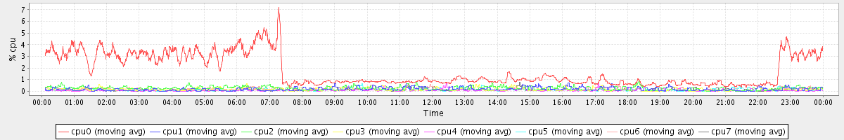 avg(cpu0) = 1.74 avg(cpu1) = 0.18 avg(cpu2) = 0.26 avg(cpu3) = 0.15 avg(cpu4) = 0.07 avg(cpu5) = 0.11 avg(cpu6) = 0.16 avg(cpu7) = 0.10