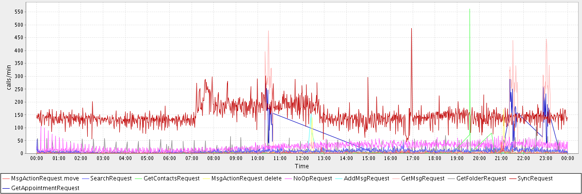 max(MsgActionRequest.move) = 43.00 max(SearchRequest) = 54.00 max(GetContactsRequest) = 561.00 max(MsgActionRequest.delete) = 172.00 max(NoOpRequest) = 105.00 max(AddMsgRequest) = 155.00 max(GetMsgRequest) = 477.00 max(GetFolderRequest) = 109.00 max(SyncRequest) = 486.00 max(GetAppointmentRequest) = 288.00