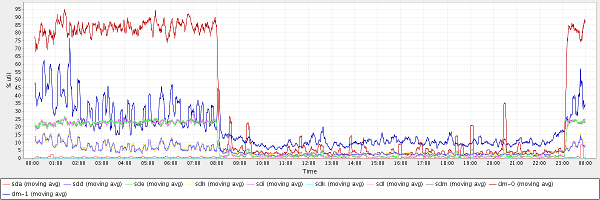 avg(sda) = 0.32 avg(sdd) = 4.71 avg(sde) = 9.32 avg(sdh) = 4.75 avg(sdi) = 9.42 avg(sdk) = 0.00 avg(sdl) = 4.70 avg(sdm) = 9.26 avg(dm-0) = 33.97 avg(dm-1) = 18.45